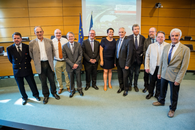 Création du Pôle métropolitain le 1er septembre 2016 en présence, avec les fonctions exercées à la date de création du Pôle, (de gauche à droite) de Monsieur Raphaël BARTOLT (Préfet du Doubs), Monsieur Jean-Louis NORIS (Président de la Communauté de communes du Pays de Pont-de-Roide ), Monsieur Christian RAYOT (Président de la Communauté de communes Sud Territoire), Monsieur Fernand BURKHALTER (Président de la Communauté de communes du Pays d’Héricourt), Monsieur Damien MESLOT (Président du Grand Belfort), Madame Estelle GRELIER (Secrétaire d’État auprès du Ministre de l’Aménagement du territoire, de la Ruralité et des Collectivités territoriales, chargée des Collectivités territoriales), Monsieur Charles DEMOUGE (Président de Pays de Montbéliard Agglomération), Monsieur Claude PERROT (Président de la Communauté de communes des Balcons du Lomont), Monsieur Michel NARDIN (Président de la Communauté de communes du Tilleul et de la Bourbeuse), Monsieur Christian HIRSCH (Président de la Communauté de communes des Trois Cantons), Monsieur André-Marie DEPOUTOT (Président de la Communauté de communes de la Vallée du Rupt).
